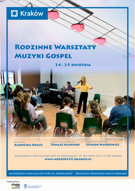 Młodzieżowy Dom Kultury Fort 49 „Krzesławice” serdecznie zaprasza na wyjątkowe rodzinne warsztaty muzyki gospel, które odbędą się 24 i 25 kwietnia 2026 roku. To doskonała okazja, aby wspólnie odkryć radość śpiewania, spędzić twórczo czas i poczuć niezwykłą energię muzyki gospel.