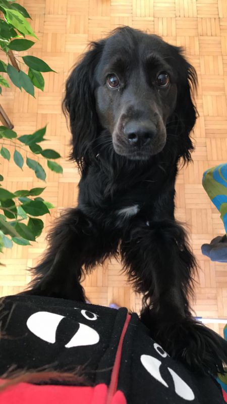 Czarna piękność w typie spaniela, wychowany w mieszkaniu od małego. Nie ma lęku separacyjnego - zostawiony sam nie niszczy, nie wyje i nie brudzi. Domowy pieszczoch - wie do czego służy kanapa :) Uwielbia ganiać piłki, jest wesołym i rezolutnym psiakiem. Nie ciągnie na smyczy. Do obcych ludzi z początku nieco nieufny, po chwili przekonuje się i daje się pogłaskać :) Szuka domu, który go pokocha i zapewni mu ruch (i zapas piłek! :) )