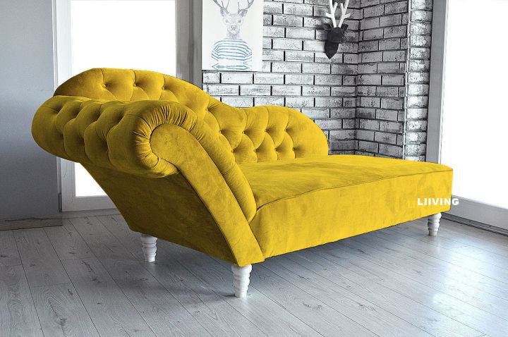 rewelacyjna kanapa szezlong leżanka w tkaninie plusz belgijski kolor ciepły zółty