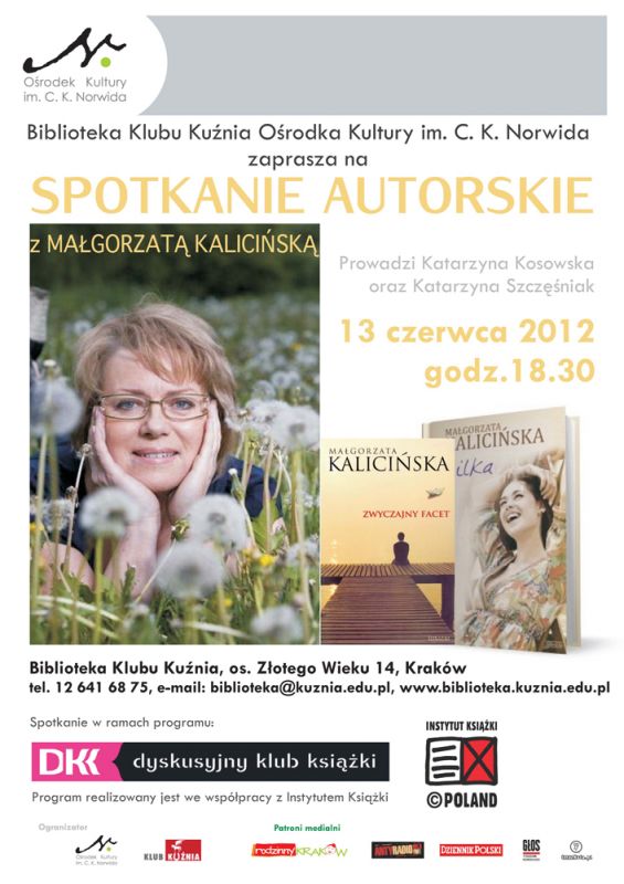W środę 13 czerwca w Bibliotece Klubu „Kuźnia” Ośrodka Kultury im. C.K.Norwida odbyło się spotkanie z Małgorzatą Kalicińską, powieściopisarką i scenarzystką, autorką m.in. popularnego cyklu powieści "Nad Rozlewiskiem". Spotkanie odbyło się w ramach Dyskusyjnych Klubów Książki - program realizowany jest we współpracy z Instytutem Książki.