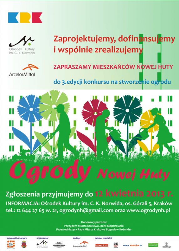 Już po raz trzeci mieszkańcy pięciu dzielnic nowohuckich zaproszeni zostali do udziału w konkursie na zagospodarowanie terenów zielonych w swoim najbliższym otoczeniu. W ten sposób pomysłodawcy i organizatorzy projektu OGRODY NOWEJ HUTY - Ośrodek Kultury im. C. K. Norwida i ArcelorMittal Poland zachęcają wszystkich nowohucian do włączenia się w proces odnowy zieleni miejskiej.