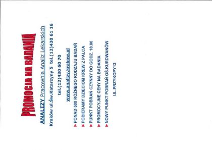 W LABORATORIUM ANALITYCZNYM "ANALIZY"-WYKONUJEMY PEŁNĄ DIAGNOSTYKĘ KRWI ,MOCZU,KAŁU-PONAD 500 ROŻNEGO RODZAJU BADAŃ WSZYSTKIE BADANIA WYKONUJEMY BEZ SKIEROWANIA