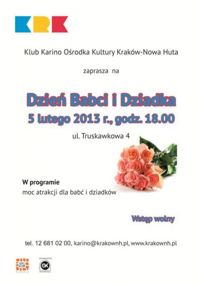 Impreza przygotowana przez dzieci dla bab i dziadkw z okazji ich wita. Najmodsi zaprezentuj osignicia zdobyte podczas uczestnictwa w rnorodnych kursach organizowanych przez Klub Karino Orodka Kultury Krakw-Nowa Huta oraz przygotuj sodki poczstunek.