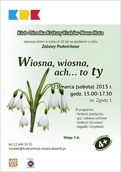 Dzieci w wieku 6-10 lat zapraszamy na spotkanie z cyklu Zabawy podwrkowe. W programie imprezy w Klubie Orodka Kultury Krakw-Nowa Huta m.in.: konkurs plastyczny, gry i zabawy ruchowe, konkurs Czy wiesz?, zagadki i krzywki. Z pewnoci kady znajdzie co dla siebie.
