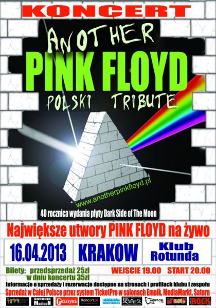 | Zesp Pink Floyd to zarwno dla fanw, jak i krytykw, muzyczny fenomen wszechczasw. Mimo e zesp nie koncertuje ju od kilkunastu lat, a jego ostatnia pyta ukazaa si prawie 20 lat temu, nadal zajmuje czoowe miejsca na listach sprzeday wszechczasw. Legend zespou utrwalaj liczne zespoy coverujce twrczo Floydw, w tym ten najbardziej znany, z Australii, ktry od kilku lat regularnie odwiedza Polsk i wypenia najwiksze hale widow(...) ... więcej » |