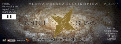 Cykl imprez Bass Performance organizowany przez wiey krakowski kolektyw producencki Knight Shaw to comiesiczne bassowe amanie eber. Co miesic czterech polskich artystw prezentuje szeroko rozumian muzyk bassow - zaczynajc od electro, dubstepu i drum'n'bassu, poprzez bigroomy i trapy, a na psytranceach koczc. Uczestnicy Bass Performance maj zagwarantowan muzyczn uczt, ktrej motto to: "albo grubo, albo wcale!". Cykl zawiera si w (...)  ... więcej »