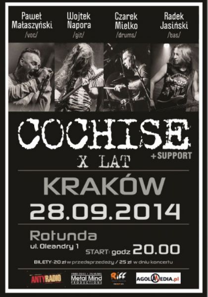 | Cochise to zesp grajcy muzyk, bdc oryginalnym poczeniem rocka, metalu i grungeu. Grupa powstaa w 2004 roku, ale aktywn dziaalno koncertow i studyjn rozpocza cztery lata temu, wydajc debiutancki album Still Alive. Od tego czasu zesp zagra ponad sto wietnie przyjtych klubowych i plenerowych koncertw w caym kraju oraz nagra dwie kolejne pyty wydane przez wytwrnie Mystic i Metal Mind. Premiera najnowszego krka 118(...) ... więcej » |