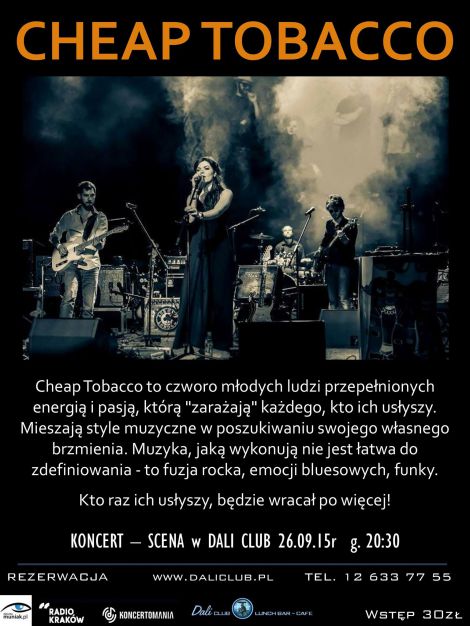 | Cheap Tobacco to czworo modych ludzi przepenionych energi i pasj, ktr "zaraaj" kadego, kto ich usyszy. Mieszaj style muzyczne w poszukiwaniu swojego wasnego brzmienia. Potrafi wzruszy, nakoni do refleksji oraz porwa do szaleczego, transowego taca. Muzyka, jak wykonuj nie jest atwa do zdefiniowania - to fuzja rocka, emocji bluesowych, funky. Nie boj si eksperymentowania i zmiany aranacji, dlatego te graj elektrycznie lub(...) ... więcej » |