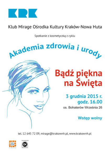 | Klub Mirage Orodka Kultury Krakw-Nowa Huta (os. Bohaterw Wrzenia 26) zaprasza 3 grudnia o godz. 16.00 na spotkanie z konsultantkami kosmetycznymi dla pa w ramach cyklu Akademia Zdrowia i Urody. Panie dowiedz si jak w prosty sposb, po przedwitecznym zamieszaniu i porzdkach, wyglda piknie i promiennie przy witecznym stole a w noc sylwestrow olni makijaem. W programie spotkania: zabiegi pielgnujce na twarz, pokaz makijau oraz (...) ... więcej » |