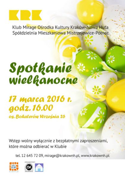 | Tradycyjnie ju, jak co roku, zapraszamy wszystkich mistrzejowickich seniorw na spotkanie Wielkanocne w Klubie Mirage Orodka Kultury Krakw-Nowa Huta (os. Bohaterw Wrzenia 26). Spotkanie, ktre odbdzie si 17 marca o godz. 16.00, bdzie kolejn okazj, aby Seniorzy zjednoczyli si w jedn seniorsk rodzin. Nie zabraknie tradycyjnych, wielkanocnych potraw, ycze przy dzieleniu si jajeczkiem oraz ciepa i serdecznoci, ktrej wszyscy potrze(...) ... więcej » |
