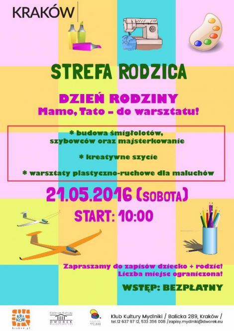 Klub Jdru Orodka Kultury Krakw-Nowa Huta (os. Centrum A 6a) serdecznie zaprasza na kreatywne i inspirujce warsztaty dla dzieci i rodzicw, podczas ktrych stworzymy i niesamowite dziea sztuki i - bardzo praktyczne przedmioty. 21 maja o godz. 11:00 wsplnie bdziemy klei, malowa, zszywa, wycina (niekoniecznie w takiej kolejnoci) i odkrywa, e nasza wyobrania i talent nie maj granic.