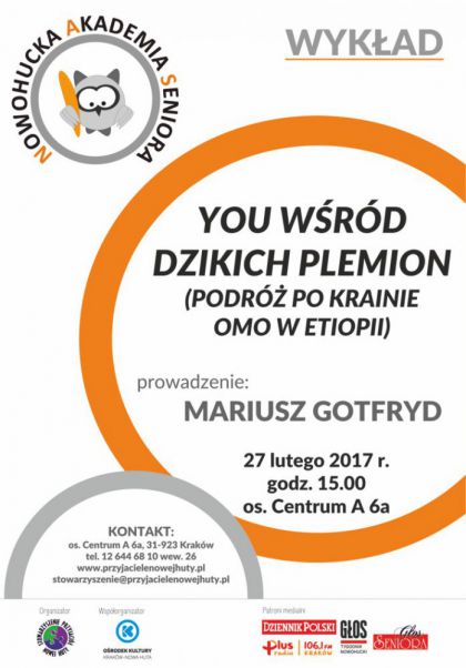 | Nowohucka Akademia Seniora (os. Centrum A 6a) zaprasza na wykad w poniedziaek 27 lutego o godz. 15.00. "You wrd dzikich plemion" to multimedialna podr po Etiopii, ktr zamieszkuj najdziksze plemiona Afryki: Konso, Mursi czy Hamerowie, ktrzy do niedawna nie wiedzieli nawet o istnieniu kontynentu Afrykaskiego. Autor podczas swojego pobytu poznawa ich kultur i obyczaje. Pokaz wzbogacony zostanie eksponatami - pamitkami podarowanymi auto(...) ... więcej » |