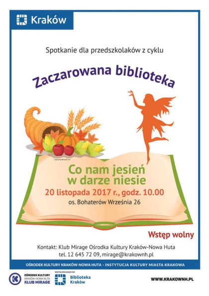Klub Mirage Orodka Kultury Krakw-Nowa Huta (os. Bohaterw Wrzenia 26) zaprasza przedszkolaki na wypraw do Zaczarowanej biblioteki w poniedziaek 20 listopada o godz. 10.00. W tym miesicu przedszkolaki wraz z Panem Listopadem dowiedz si, jakie niespodzianki przygotowaa dla nas Pani Jesie. Orzechy, kolorowe licie czy moe deszcz i jesienn szarug. Tego wszystkiego dowiecie si na kolejnym spotkaniu. Serdecznie zapraszamy. Zaczarowana bib(...)  ... więcej »