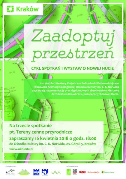 Zaadoptuj przestrze to cykl tematycznych spotka i wystaw, prezentujcych prace dyplomowe studentw i absolwentw kierunku Architektura Krajobrazu Wydziau Architektury Politechniki Krakowskiej, powiconych rnym przestrzen(...) ... więcej » |
