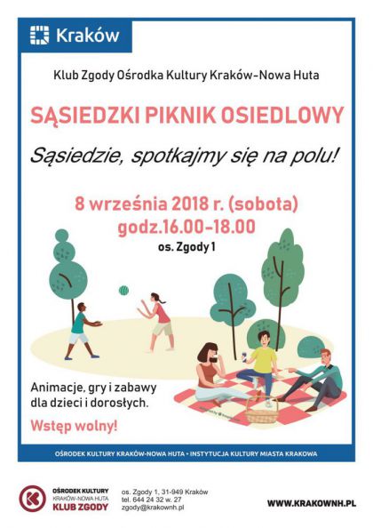 | Klub Zgody Orodka Kultury Krakw-Nowa Huta (os. Zgody 1) zaprasza 8 wrzenia w godz. 16.00-18.00 mieszkacw os. Zgody i okolicznych osiedli na dwie godziny wsplnej ssiedzkiej zabawy i piknikowania. Na duych i maych uczestnikw pikniku czeka bd gry i zabawy podwrkowe, a wrd nich m.in. kcik plastyczny, gry stolikowe, puszczanie baniek mydlanych, zabawy z chust animacyjn, krgle, zabawy z szarf i woreczkami czy rzut do celu. Bdzie t(...) ... więcej » |