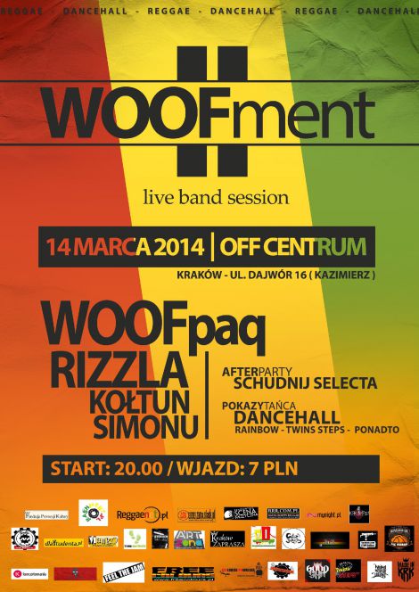 14 marca w klubie OFF CeNtrum odbdzie si druga impreza z cyklu WOOFment - tym razem z ywymi bandami w klimatach reggae i dancehall. Obok gospodarzy, czyli ekipy WOOFpaq, wystpi zespoy RIZZLA i KOTUN, a take wokalista SIMONU, ktry rwnie poprowadzi imprez. Afterparty zagra SCHUDNIJ SELECTA z Wrocawia, a cao wzbogac wystpy ekip tanecznych: RAINBOW, PONADTO i TWINS STEPS.