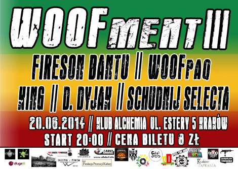 20 czerwca w krakowskim klubie "Alchemia" odbdzie si kolejna reggae'owa impreza z cyklu WOOFment. Na trzeciej edycji koncerty zagraj: kenijski artysta FIRESON BANTU, ghanijsko-jamajski wokalista KING, frontman krakowskiego zespou Rizzla D. DYJAK oraz gospodarze cyklu - grupa WOOFpaq. Afterparty poprowadzi wrocawiak SCHUDNIJ SELECTA.