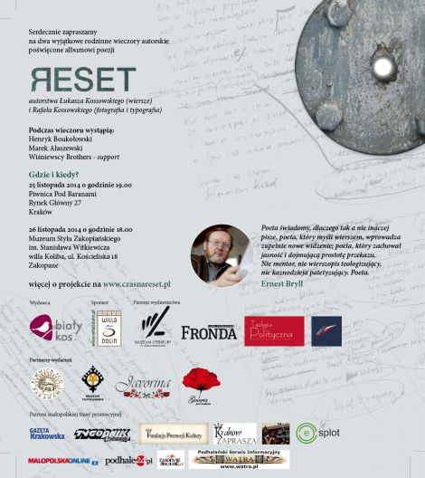 Pocztkiem sta si tomik poezji ukasza Kossowskiego zatytuowany RESET, w ktrym wan rol odgrywa poezja w poczeniu z nastrojowymi fotogramami Rafaa Kossowskiego. Brakowao muzyki... T, do wierszy, napisali Marek Aaszewski i Krzysztof Winiewski.