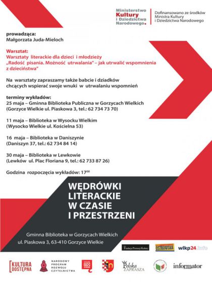 Warsztaty literackie s czci projektu "Wdrwki literackie w czasie i przestrzeni" realizowanego przez Gminn Bibliotek Publiczn w Gorzycach Wielkich, dofinansowanego przez Ministerstwo Kultury i Dziedzictwa Narodowego.