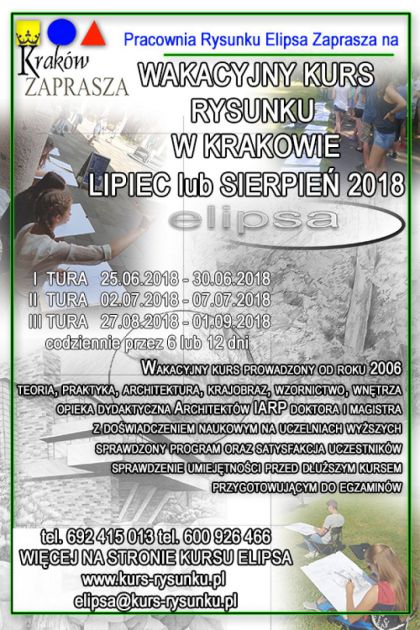 Zajcia prowadzone s w profesjonalnej pracowni kursu rysunku przez architektw, czonkw SARP i IARP, doktora in. arch. oraz magistra in. arch. WAPK, KAAFM z dowiadczeniem branowym i dydaktycznym. W programie przedstawiamy system pracy projektanta, prezentujemy oryginalne oprogramowanie CAD, ktrym dysponuje nasza pracownia, a przede wszystkim prezentujemy sztuk rysowania w technice owkowej i nie tyko. Zajcia odbywaj si w Pracowni Elipsa przy ul. Krowoderskiej 6/14 oraz w plenerach Krakowie. Naszym atutem jest praktyczna wiedza w zakresie projektowania oraz dowiadczenie w nauce rysunku od 1998 roku. Elipsa jest jednym z najduej dziaajcych kursw rysunku w Krakowie.