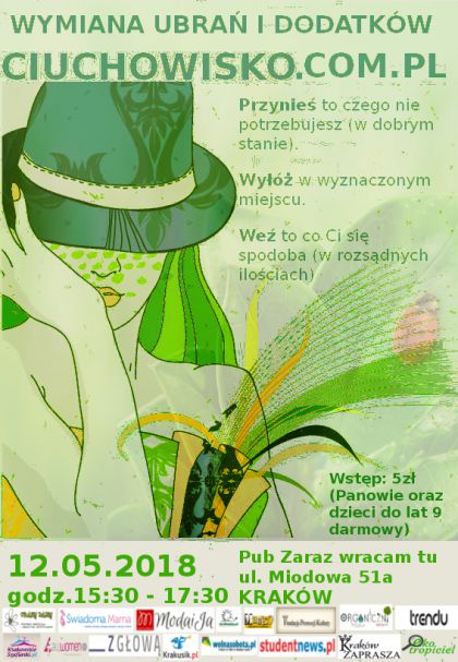 Kolejna edycja szalonej wymiany ubra i dodatkw czyli Krakowskiego Ciuchowiska ju 12 maja. Widzimy si na Kazimierzu jednak w innej ni ostatnio lokalizacji tj. w Pubie Zaraz wracam tu (ul.Miodowa 51a).