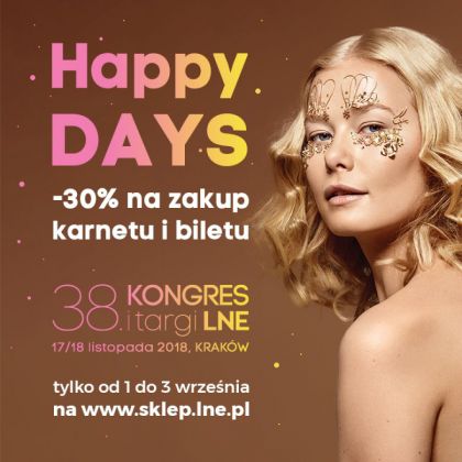 Sprzeda karnetw i biletw na 38. Kongres i Targi LNE rozpocznie si ju 1 wrzenia trzydniow akcj HAPPY DAYS! Tym razem wprowadzamy nowo rabat -30% bdzie obejmowa zarwno bilety, jak i karnety na Kongres! Ju dzi zapiszcie sobie t dat w kalendarzu i skorzystajcie z wyjtkowej promocji.