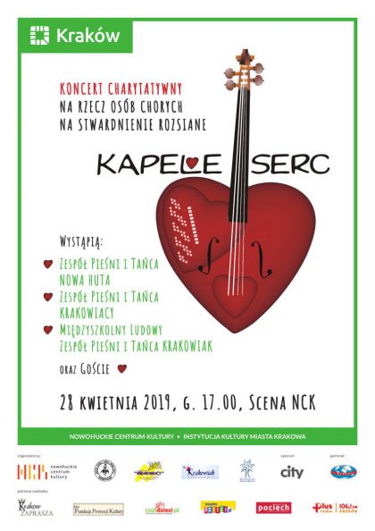 W tym roku mija 11 lat od momentu, kiedy po raz pierwszy w naszym kraju zagray Kapele Serc. Pomysodawc tej oglnopolskiej akcji charytatywnej jest Polska Sekcj CIOFF, ktra skutecznie promuje wydarzenie i z roku na rok zyskuje sobie coraz wiksze grono odbiorcw. W 2010 roku akcja, dziki staraniom Midzyszkolnego Ludowego Zespou Pieni i Taca Krakowiak, pojawia si w Krakowie. Do grona organizatorw krakowskich Kapeli Serc doczy Zesp Pieni i Taca Nowa Huta, a take Zesp Pieni i Taca Krakowiacy. Tegoroczny koncert odbdzie si 28.04.2019 r. Na scenie zobaczymy ca palet rnorakich formacji artystycznych. Publiczno bdzie moga podziwia zarwno m.in. taniec towarzyski, angielskie i szkockie tace balowe, taniec hollywoodzki, jak i wspczesny. Nie zabraknie oczywicie folkloru, ktry pojawi si w wykonaniu MLZPiT Krakowiak, ZPiT Nowa Hutai ZPiT Krakowiacy. W trakcie trwania koncertu zorganizowana zostanie zbirka pienidzy do puszek, jak rwnie loteria fantowa z atrakcyjnymi przedmiotami do wylosowania (m.in. ksiki, biuteria, czy podarunek od Pana Prezydenta Jacka Majchrowskiego przekazany czonkowi Powiatowej Spoecznej Radzie ds. Osb Niepenosprawnych, p. Magorzacie Felger). Wikszo rzeczy, ktre znajd si na loterii pochodz od osb zaprzyjanionych z ww. Towarzystwem i z organizatorami. Tradycj jest to, i krakowskie Kapele Serc dochd z loterii fantowej i zbirki pienidzy do puszek przekazuj Polskiemu Towarzystwu Stwardnienia Rozsianego (Oddzia w Krakowie).