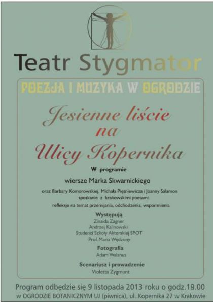 W programie: "Jesienne licie na Ulicy Kopernika" - wiersze m.in.: Barbary Komorowskiej, Joanny Salamon, Micha Pitniewicza, Marka Skwarnickiego; wspomnienia i refleksje o przemijaniu, spotkanie z poetami wsppracujcymi z Klubem Artystyczno-Literackim Teatru "Stygmator" m.in.:Andrzejem Kalinowskim, Jerzy Pitkowskim, Elbiet Kut.