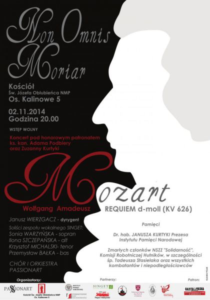 O godzinie 20:00 w kociele w. Jzefa Oblubieca NMP na os. Kalinowym 5 w Nowej Hucie zabrzmi jedno z najwybitniejszych i najbardziej znanych dzie literatury muzycznej - Requiem d-moll Wolfganga Amadeusza Mozarta, w wykonaniu Chru i Orkiestry Stowarzyszenia PASSIONART. W partiach solowych zaprezentuj si piewacy na co dzie zwizani z krakowskim zespoem wokalnym SINGET.