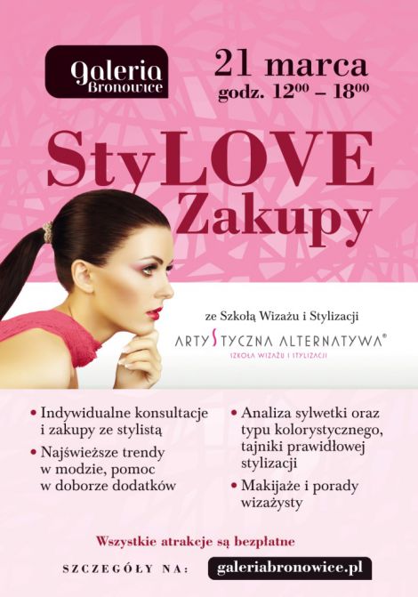 Pierwszy weekend wiosny to nie tylko doskonaa okazja do wymiany garderoby na lejsz, ale i odwieenia swojego wizerunku. Ju w najblisz sobot, 21 marca, przekonaj si o tym klientki Galerii Bronowice, ktre w ramach akcji styLOVE zakupy bd mogy skorzysta z bezpatnych porad stylistw, wybra si na zakupy z profesjonalnym doradc, a take pozna swj wiosenny makijaowy look.