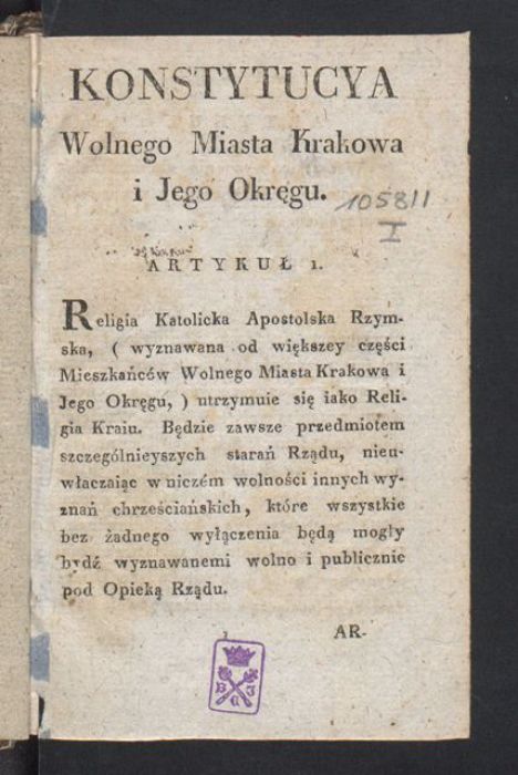 Zdjcie: Konstytucja Wolnego Miasta Krakowa i jego okrgu, w. Biblioteki Jagielloskiej