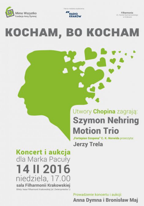 Fundacja Anny Dymnej Mimo Wszystko i Filharmonia Krakowska, ju po raz smy, organizuj walentynkowy koncert charytatywny na rzecz chorych oraz niepenosprawnych artystw znajdujcych si w trudnej sytuacji materialnej. W tym roku zbierane bd pienidze na rehabilitacj Marka Pacuy, ktry po wypadku w 2012 r. przeszed operacj krwiaka mzgu, zapad w piczk i do dzisiaj wymaga 24-godzinnej opieki swojej maonki Barbary Natkaniec-Pacuy. Koncertowi, ktrego tytu brzmi: Kocham, bo kocham, towarzyszy bdzie aukcja pir, zegarkw oraz Magicznych Przedmiotw ofiarowanych przez znane postacie naszego ycia publicznego (m.in. Prezydenta Andrzeja Dud, Jerzego Owsiaka, kard. Stanisawa Dziwisza). Licytacj poprowadz Anna Dymna i Bronisaw Maj.