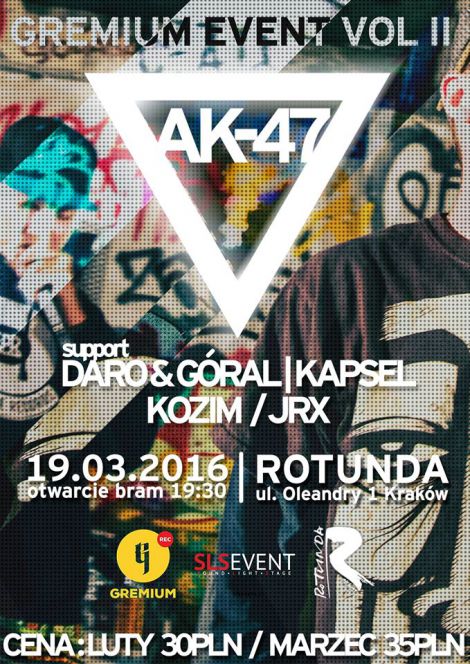Zapraszamy wszystkich na drugi GremiumEvent vol. II: AK-47 ! Ju 19.03.2016 w Rotunda Centrum Kultury przy ul. Oleandry 1 w Krakowie, odbdzie si koncert spod szyldu GremiumEvent! Otwarcie bram 19:30, start koncertw 20:30 Zagra dla Was Ak-47 (Official Fanpage PL) wsparty przez ludzi wsppracujcych z GremiumRec. - Daro & Gral - Kozim / JRX Kapsel
