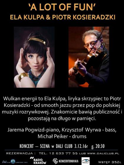 Wulkan energii to Ela Kulpa, liryka skrzypiec to Piotr Kosieradzki - od smooth jazzu przez pop do polskiej muzyki rozrywkowej. Znakomicie bawi publiczno i pozostaj na dugo w pamici.