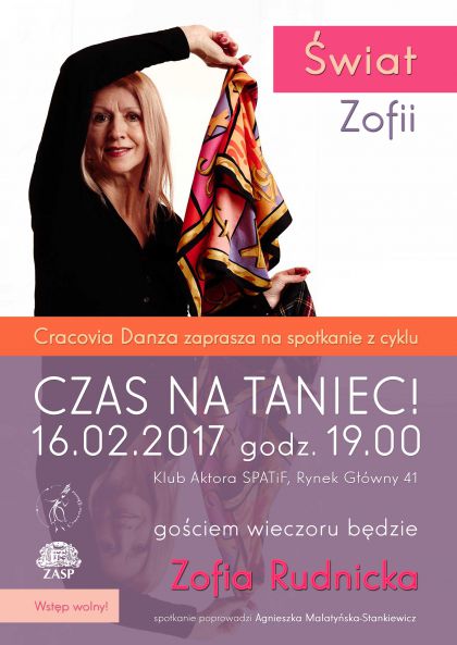 Realizuje si na wielu polach artystycznych: tancerka, choreograf, aktorka, wykadowca, od lat 70. zwizana z TVP, gdzie przeya m.in.: wspaniay romans z Kabarecikiem Olgi Lipiskiej, obecnie wsppracuje z TVN m.in. z programem "You can dance. ZOFIA RUDNICKA bo o niej mowa bdzie gwiazd najbliszego spotkania CZAS NA TANIEC! Tym razem kolejny odcinek z cyklu Baletu Cracovia Danza zosta zatytuowany wiat Zofii. Spotkanie odbdzie si w czwartek, 16 lutego 2017 roku o godz. 19, w Klubie Aktora SPATiF, Krakw Rynek Gwny 41.