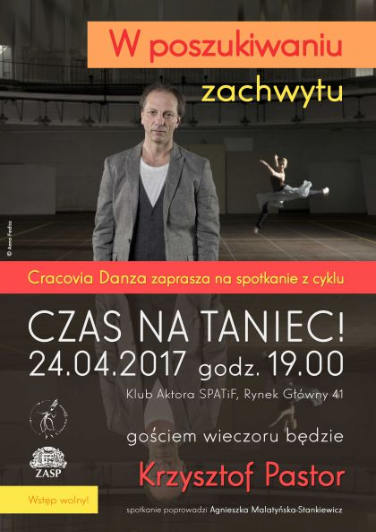 Ju w poniedziaek, 24 kwietnia Krzysztof Pastor bdzie gociem spotkania CZAS NA TANIEC!, cyklu przygotowywanego przez Balet Cracovia Danza. Spotkanie, ktre otrzymao tytu W poszukiwaniu zachwytu, rozpocznie si o godz. 19 w Klubie Aktora SPATiF, Rynek Gwny 41. Rozmow poprowadzi Agnieszka Malatyska-Stankiewicz. Spotkanie odbdzie si z okazji przypadajcego 29 kwietnia Midzynarodowego Dnia Taca.