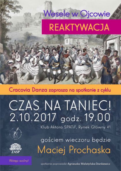 Balet Cracovia Danza w lipcu tego roku dokona rejestracji zrekonstruowanej partytury pierwszego polskiego baletu narodowego Wesele w Ojcowie. Pyt nagra zesp instrumentw dawnych The Violin Consort pod kierunkiem Zbigniewa Pilcha, za rekonstrukcji dziea dokona Maciej Prochaska, muzykolog z Instytutu Kolberga w Poznaniu. I wanie temu przedsiwziciu bdzie powicony kolejny, a pierwszy w tym sezonie artystycznym odcinek spotkania CZAS NA TANIEC!, cyklu Baletu Cracovia Danza. Gociem spotkania zatytuowanego Wesele w Ojcowie reaktywacja, ktre odbdzie si w poniedziaek, 2 padziernika, o godz. 19, w Klubie Aktora SPATiF (Rynek Gwny 41) bdzie Maciej Prochaska. Zdradzi on nie tylko tajemnice odtwarzania partytury, ale take wskae rda bez ktrych rekonstrukcja nie byaby moliwa. Spotkanie, ktrego wsporganizatorem jest Odzia ZASP w Krakowie, poprowadzi Agnieszka Malatyska-Stankiewicz.