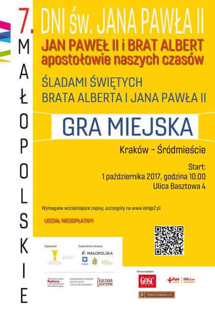 Tematyczna gra miejska realizowana jest w ramach Projektu pn. Jan Pawe II i Brat Albert - apostoowie naszych czasw. VII Maopolskie Dni w. Jana Pawa II dofinansowanego ze rodkw Ministra Kultury i Dziedzictwa Narodowego w ramach programu Kultura Dostpna.