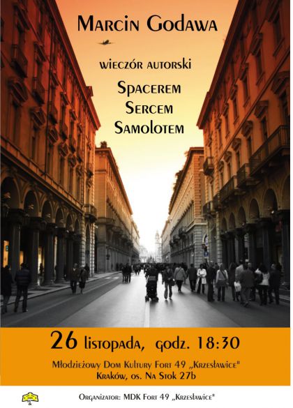 Zapraszamy na wieczr autorski Marcina Godawy, ktry odbdzie si w dniu 26 listopada 2017, o godz. 18:30 w Modzieowym Domu Kultury Fort 49 Krzesawice, os. Na Stoku 27b.