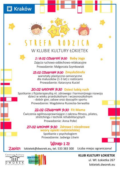 Ze wzgldu na ograniczon ilo miejsc na zajcia odbywajce si w czwartki (Baby Joga, ZmysoStrefa i Fit Mama) obowizuj zapisy: lokietek@dworek.eu lub tel. 533 383 300.