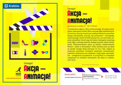 To kreatywne zajcia z filmu animowanego tradycyjn metod zdj poklatkowych. Uczestnicy tworz wasne scenariusze, rysuj storyboardy, wykonuj elementy scenografii, bohaterw. Wykorzystuj rne techniki plastyczne, od wycinanki, poprzez plastelin, kola, pikselacj.