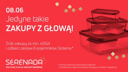 Ju w najblisz sobot 8 czerwca, klienci Serenady bd mieli okazj wzi udzia wwyjtkowej akcji promocyjnej. Po zakupach i okazaniu paragonw na minimum 400 z bd mogli odebra specjalny upominek zestaw szeciu pojemnikw lunchowych firmy Sistema. Praktyczny zestaw pojemnikw z wygodnym zamkniciem idealnie nadaje si do przechowywania ywnoci. Sprawdzi si nie tylko w pracy czy szkole, ale moe by rwnie komfortowym gadetem piknikowym.