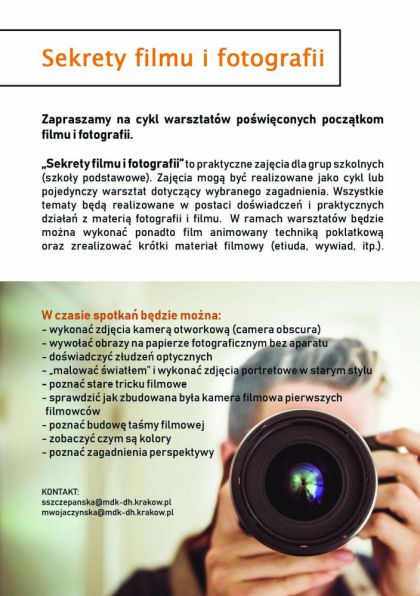Sekrety filmu i fotografii to praktyczne zajcia dla grup szkolnych (szkoy podstawowe). Zajcia mog by realizowane jako cykl lub pojedynczy warsztat dotyczcy wybranego zagadnienia. Wszystkie tematy bd realizowane w postaci dowiadcze i praktycznych dziaa z materi fotografii i filmu.