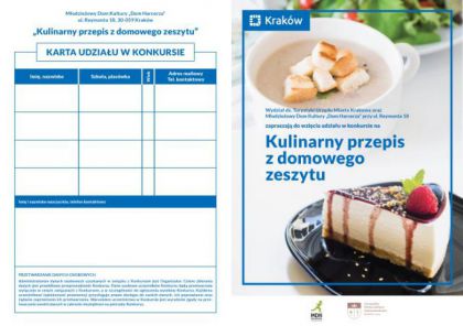Szczegowe inforamcje: http://www.mdk-dh.krakow.pl/konkursy/819-konkurs-kulinarny-przepis-z-domowego-zeszytu?fbclid=IwAR1TDtw_aOJKbURIJYeGV2Q0MmMf1nXCOQTieAMy7oBBzGgW12lrLDe153I