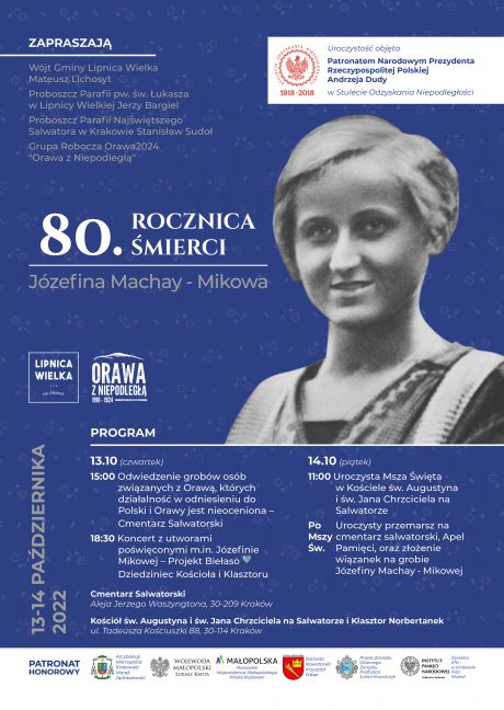 Natomiast w piątek 14.10.2022 odbędzie się uroczysta Msza Święta w Kościele św. Augustyna i św. Jana Chrzciciela na Salwatorze, uroczysty przemarsz na cmentarz salwatorski, Apel Pamięci i złożenie wiązanek na grobie Józefiny Machay Mikowej.