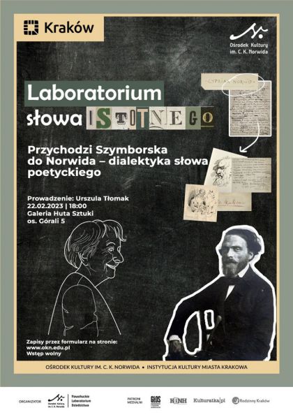 Wstęp wolny. Obowiązują zapisy (do 22 lutego 2023 r. do godz. 15:00) przez formularz na stronie: https://okn.edu.pl/nowohuckie-laboratorium-dziedzictwa/laboratorium-slowa-istotnego-przychodzi-szymborska-do-norwida-dialektyka-slowa-poetyckiego-c-k-norwida-i-w-szymborskiej-zapisy/