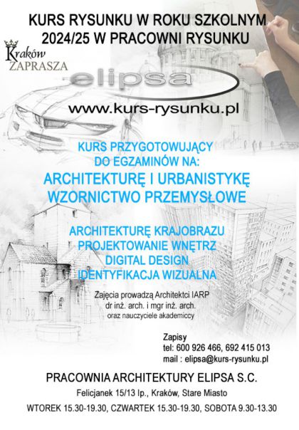 Zajęcia prowadzone są od 1998 roku w profesjonalnej pracowni kursu rysunku przez architektów, członków SARP i IARP, doktora inż. arch. oraz magistra inż. arch. WAPK z doświadczeniem branżowym i dydaktycznym. W programie przedstawiamy system pracy projektanta, prezentujemy oryginalne oprogramowanie CAD, którym dysponuje nasza pracownia, a przede wszystkim prezentujemy sztukę rysowania w technice ołówkowej i nie tyko. Zajęcia odbywają się w Pracowni Elipsa przy ul. Felicjanek 15/13 oraz w plenerach Krakowie. Ilość osób w grupach ograniczona, naszą ideą jest wysoki poziom nauczania, nie przepełniamy grup. Pracownia jest wyposażona w środki do dezynfekcji, środki czystości.