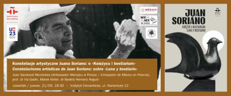 Rozmowa, którą poprowadzi Beatriz Hernanz Angulo, będzie dotyczyć relacji i przyjaźni Juana Soriano ze współczesnymi mu intelektualistami i artystami w Meksyku i Europie, jego niezwykłej kreatywości i osobowości, która odcisnęły głęboki ślad na kulturze jego kraju, a także znaczeniu rzeźbiarskiego bestiarium Soriano, które możemy podziwiać w Krakowie.