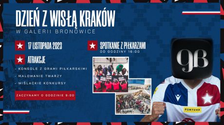 Dzień z Wisłą Kraków odbędzie się w Galerii Bronowice w piątek, 17 listopada. Sklep Official Fanshop będzie czynny od godz. 9:00. Atrakcje i pozostałe aktywności startują o godz. 15:00.