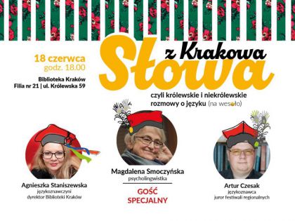 Chcemy poprzyglądać się słowom wędrującym po Krakowie, ale i po innych częściach Polski. Słowom, które w innych regionach mają swoje leksykalne bliźniaki albo wręcz wieloraczki. Tematem spotkania będą feminatywy, czyli żeńskie formy gramatyczne. Spotkanie poprowadzą: dr Agnieszka Staniszewska-Mól (językoznawczyni, dyrektorka Biblioteki Kraków) oraz dr Artur Czesak (językoznawca, dialektolog, sympatyk regionalizmów). Gościem specjalnym będzie prof. Magdalena Smoczyńska (psycholingwistka, specjalistka w dziedzinie rozwoju językowego dzieci polskich). Wydarzenie organizowane pod patronatem Radia Kraków.
